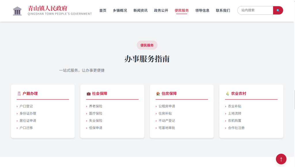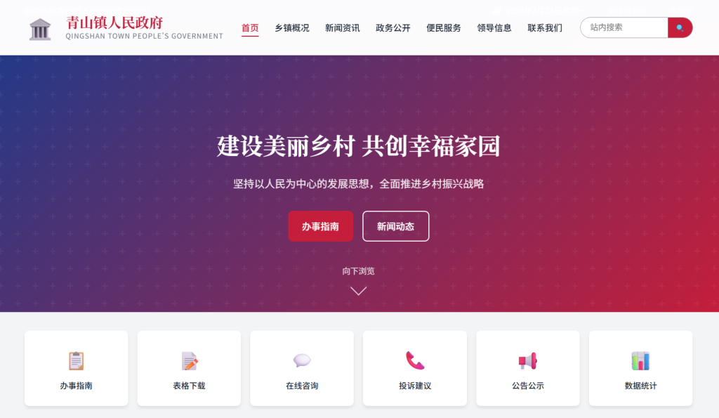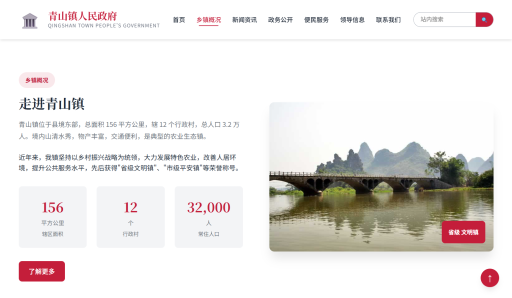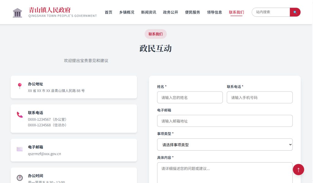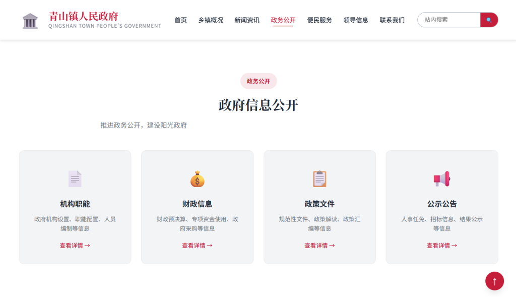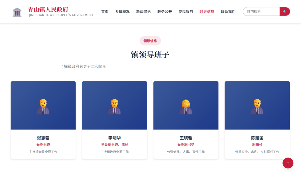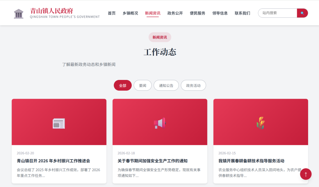 • 设计风格以 庄重正式 为主,采用中国红 + 政府蓝配色方案,注重政府网站规范性与用户体验,支持多档响应式断点适配,适合乡镇政府、街道办事处、村委会等基层政务网站场景。