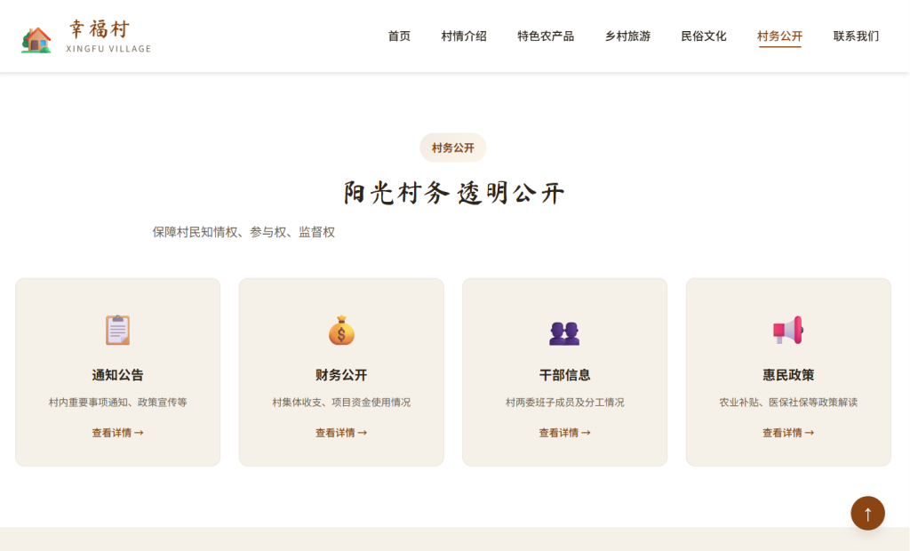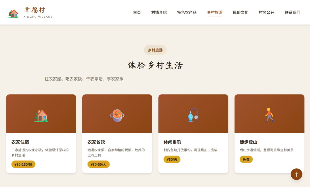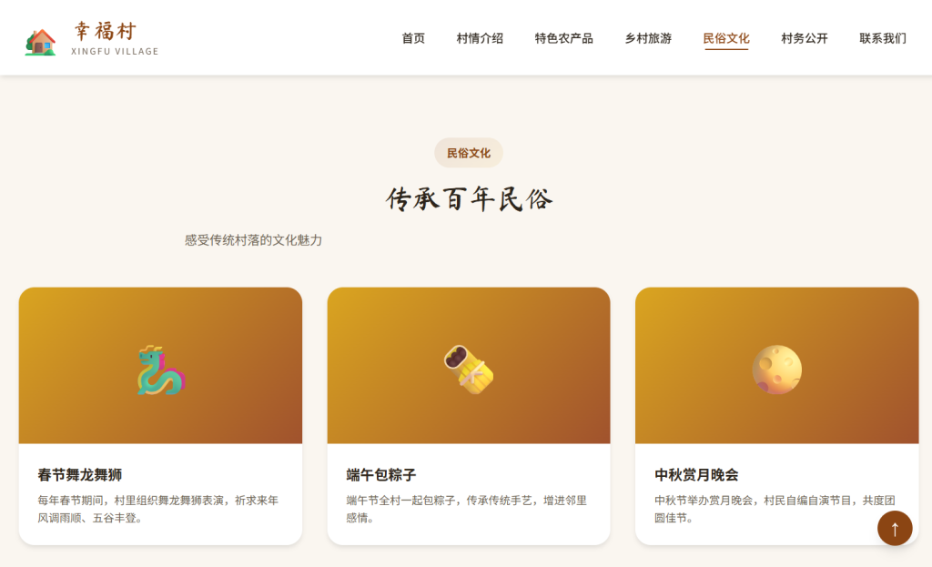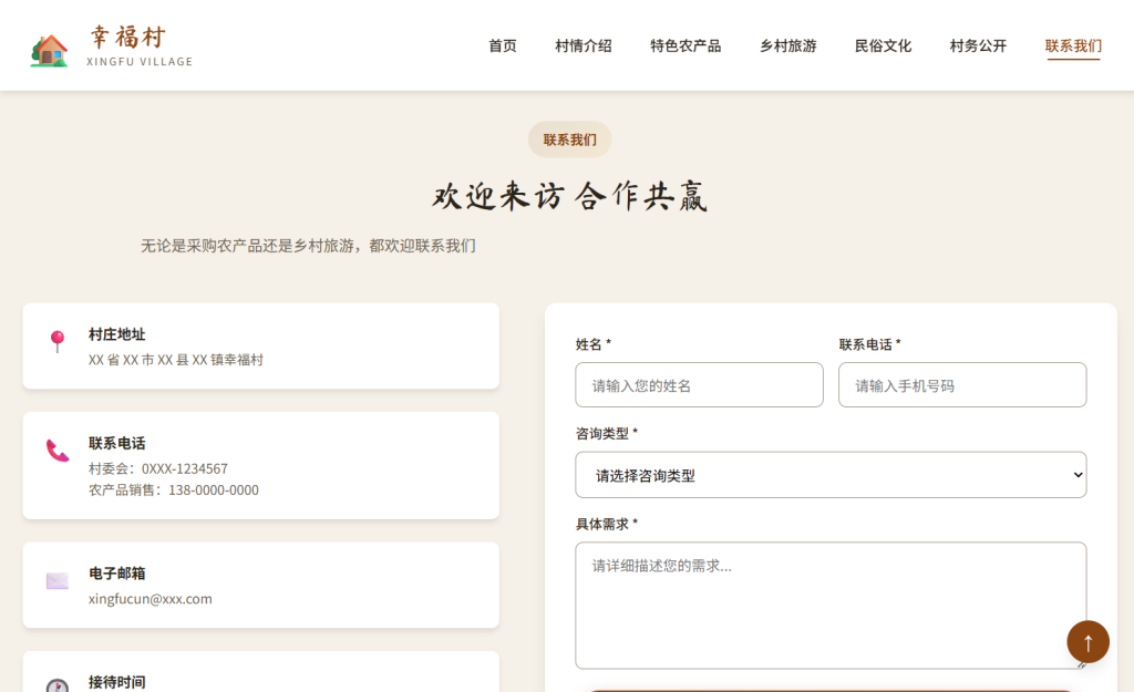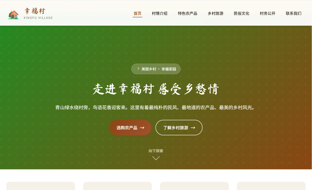 • 设计风格以 乡土自然 为主,采用棕色 + 绿色配色方案,融入书法字体元素,注重农村特色与用户体验,支持多档响应式断点适配,适合行政村、自然村、乡村旅游示范点等场景。