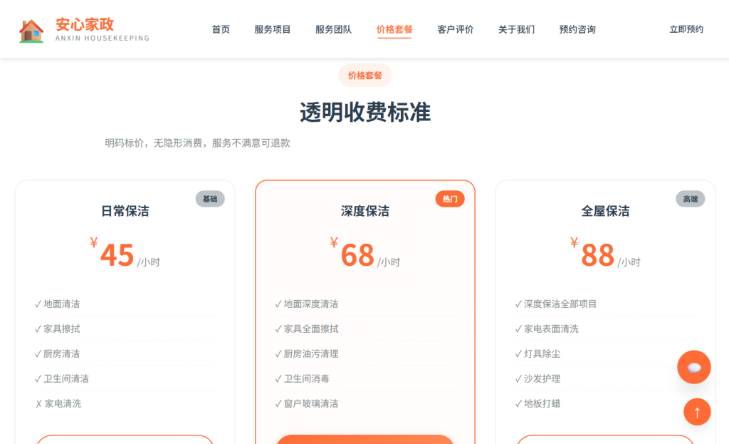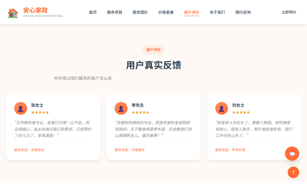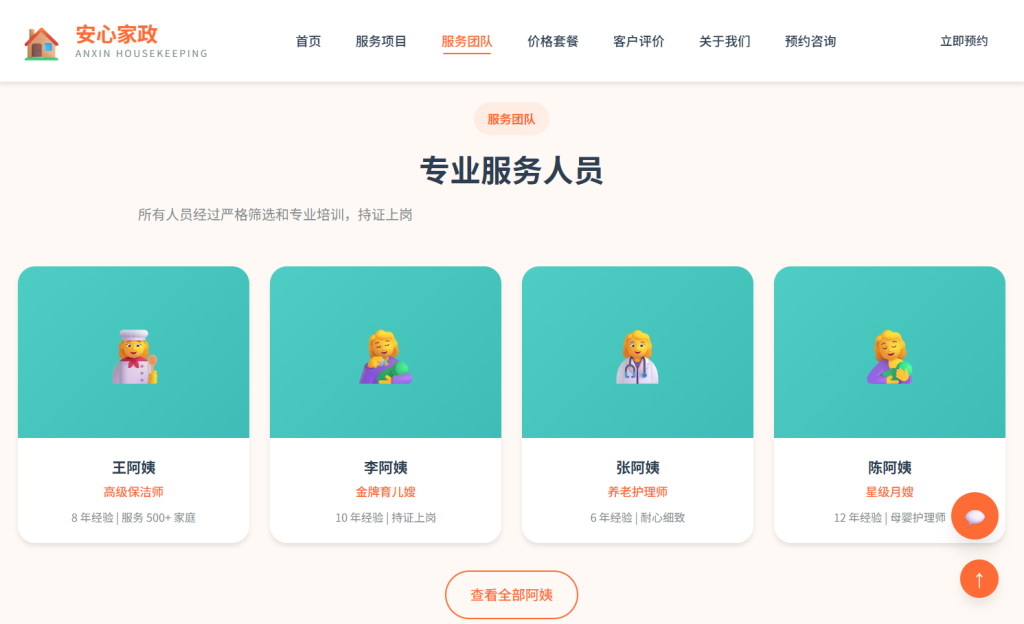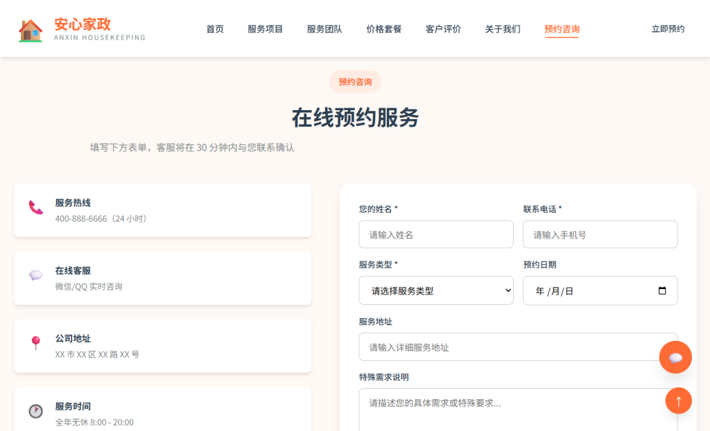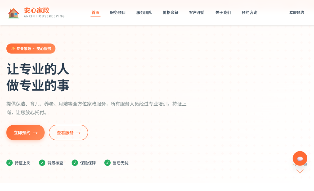 • 设计风格以 温馨专业 为主,采用橙色系配色方案,注重家政服务行业特色与用户体验,支持多档响应式断点适配,适合家政公司、保洁服务、育儿养老服务等场景。