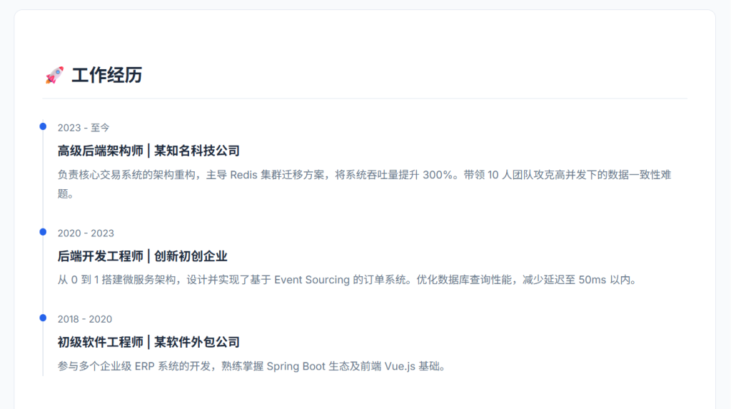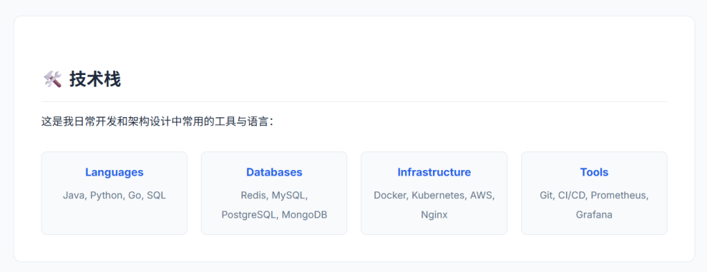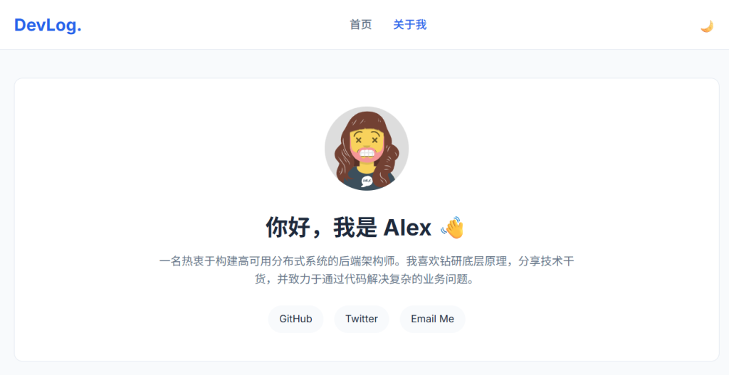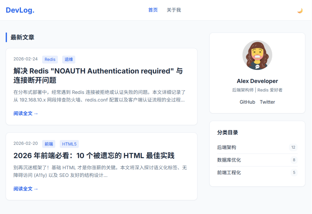 • 设计风格以极客专业为主,采用简洁的排版与高对比度配色方案(配合 CSS 变量 var(--primary-color) 实现主题色定制),注重技术内容的可读性与开发者用户体验。支持响应式布局适配,适合技术博客、个人开发者主页、架构师笔记等场景。