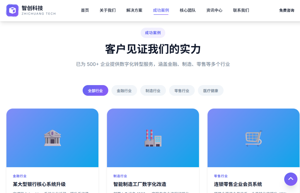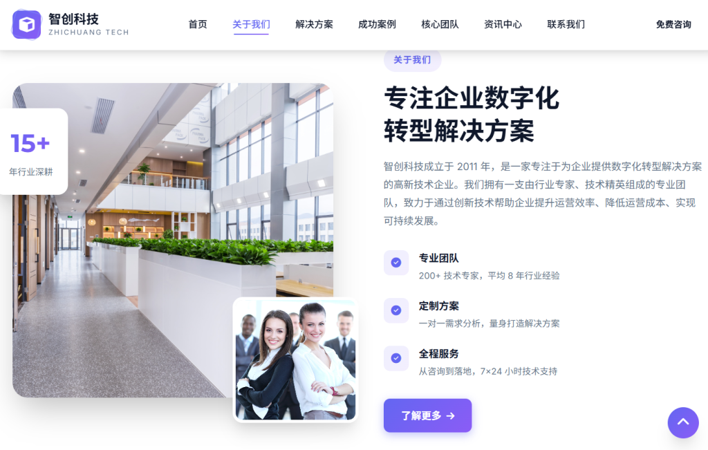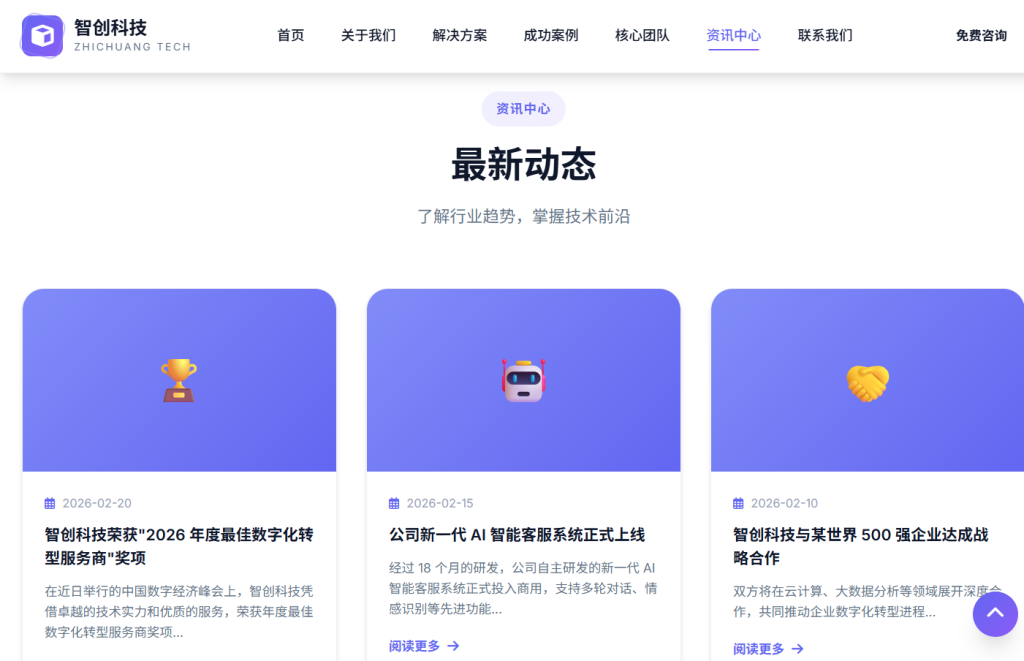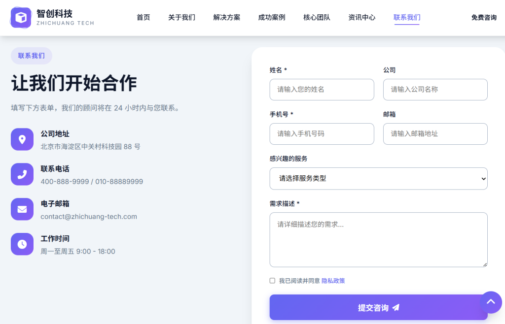 设计风格以 现代商务科技 为主,采用蓝紫色渐变配色方案,注重排版层次与交互体验,支持五档响应式断点适配,适合企业官网、产品展示页、服务落地页等场景。