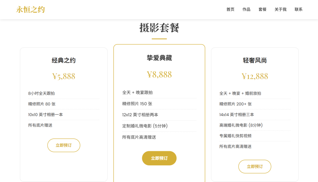 • 设计风格以 浪漫优雅 为主,采用金色系配色方案 (#d4af37),注重婚纱摄影行业特色与用户体验,支持多档响应式断点适配,适合婚纱摄影工作室、婚礼跟拍服务、个人摄影师作品集等场景。