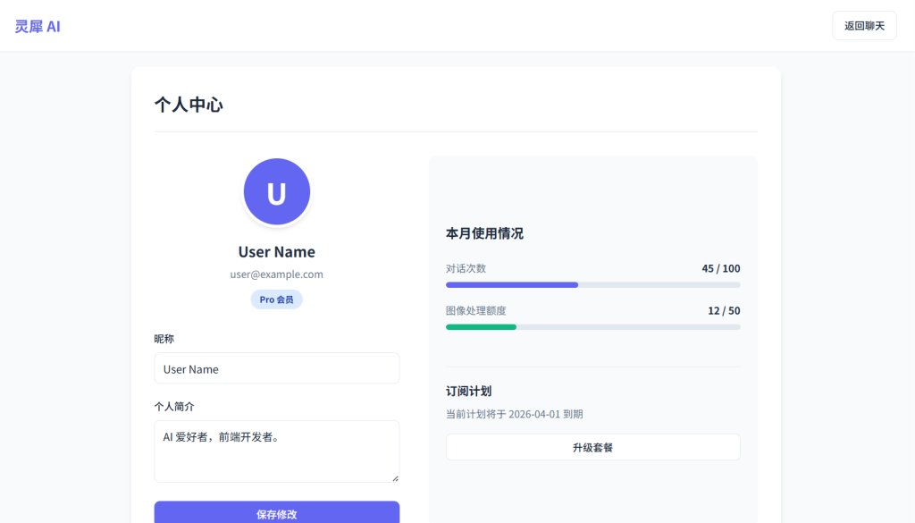 • 功能架构上,模板内置了 完整的认证模拟系统(登录/注册/状态持久化)、动态侧边栏历史管理富文本消息渲染(支持图片上传预览、代码块展示)、个人中心仪表盘 及 深度设置面板。特别设计了 移动端优先的响应式布局,通过多档断点适配,确保在桌面大屏、平板及手机端均能呈现完美的操作手感,完美适用于 AI 助手、智能客服、SaaS 对话框、企业内部知识库 等场景。